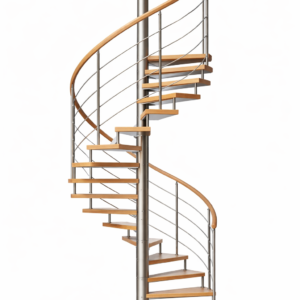 Escalera de caracol en acero y madera con diseño moderno y compacto. Fabricada a medida, combina resistencia estructural y estética para optimizar espacios con estilo.