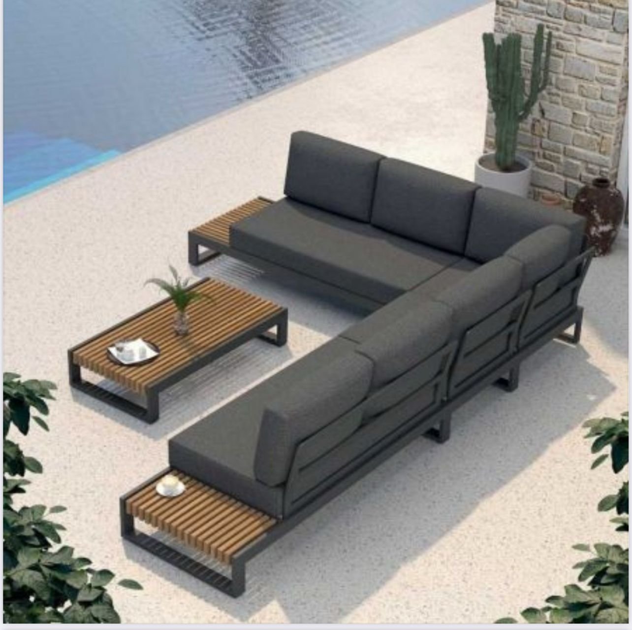 Transforma tu terraza, jardín o zona de piscina en un espacio de relax elegante con nuestro exclusivo conjunto de sofás de exterior con estructura metálica en acabado gris antracita. El diseño modular en forma de L optimiza el espacio y permite crear un rincón acogedor y moderno.