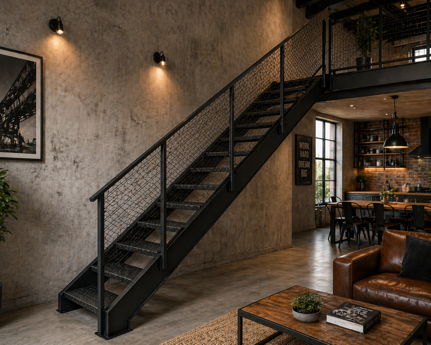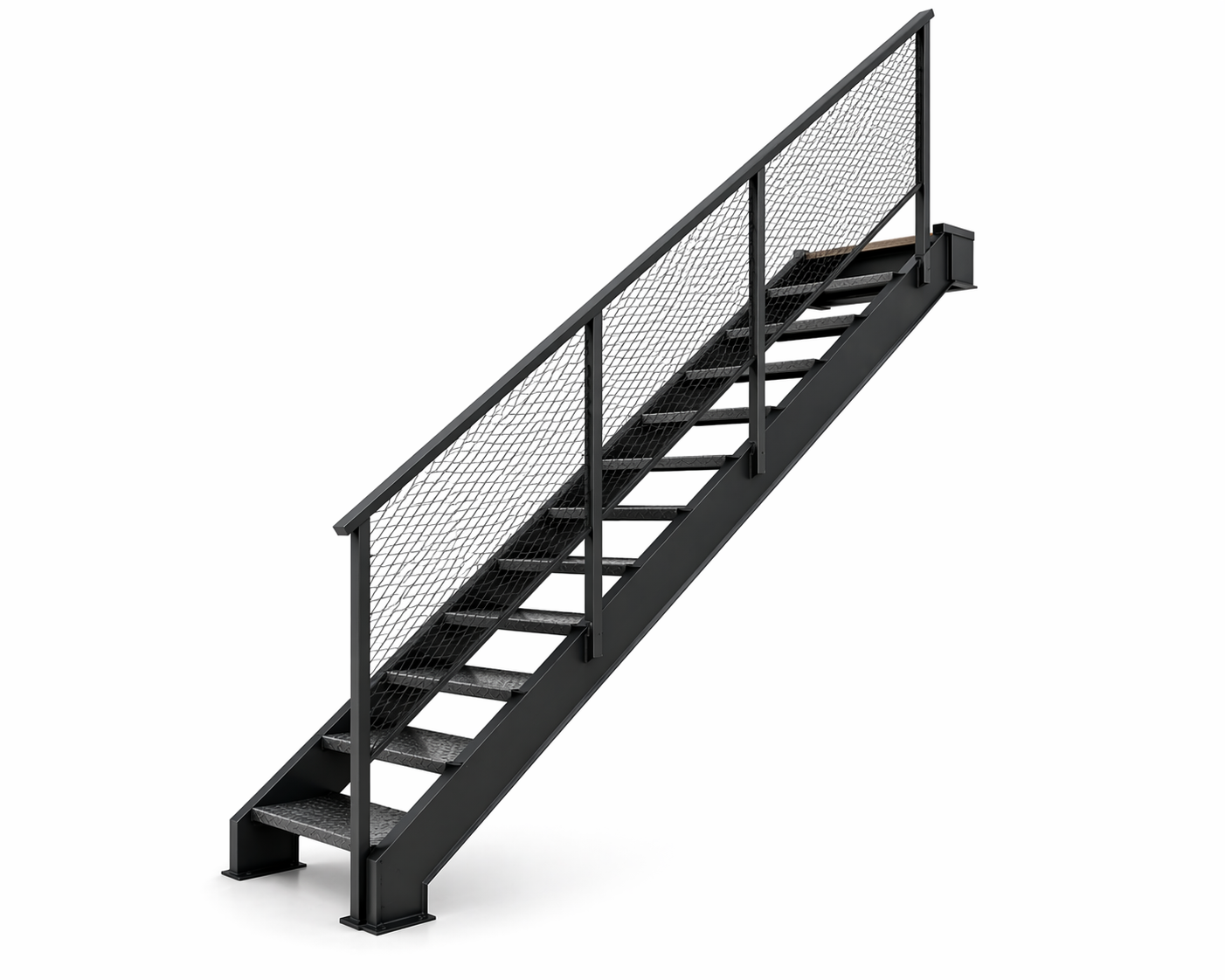 La escalera recta de acero a medida MOD-ESC-05 destaca por su diseño industrial con panel de malla metálica, ofreciendo máxima seguridad sin renunciar a una estética moderna. Ideal para viviendas contemporáneas y espacios industriales.