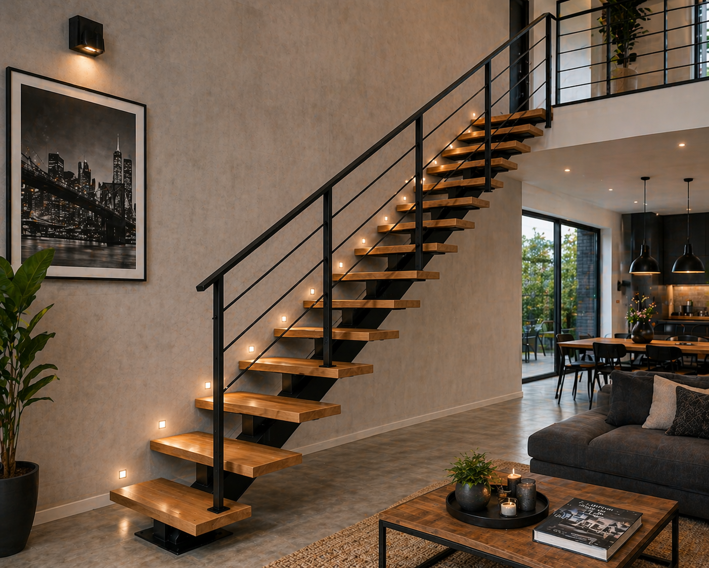 Fabricada en acero estructural de alta calidad, esta escalera garantiza estabilidad, resistencia y durabilidad. Los peldaños parecen suspendidos, generando una sensación de amplitud en el espacio.