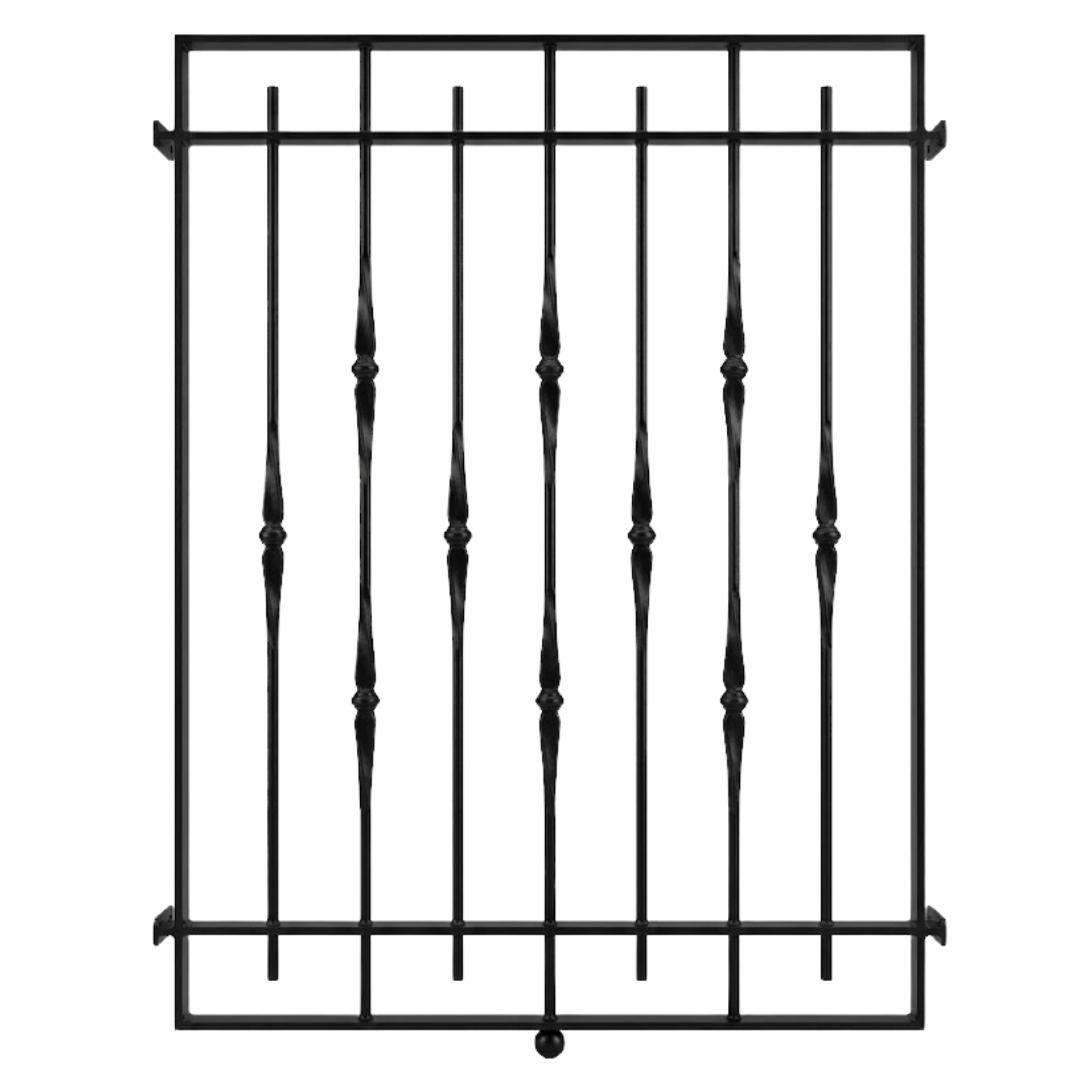 Su estructura combina barrotes verticales macizos con detalles decorativos intermedios, aportando un estilo clásico elegante sin renunciar a la robustez. El diseño exterior genera una separación respecto a la ventana, permitiendo mayor ventilación y aprovechamiento del espacio interior.